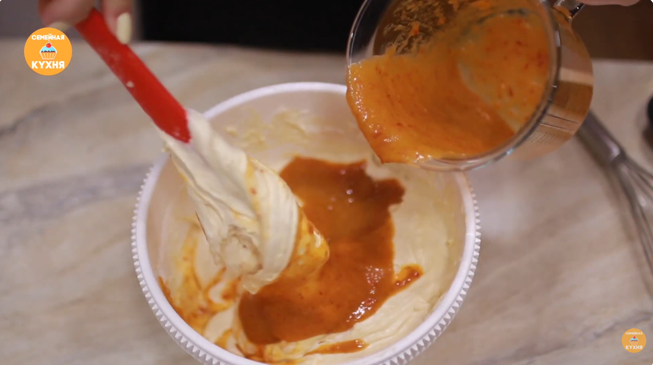 • Смешайте муку с разрыхлителем и просейте её через сито в яичную массу. Хорошенько перемешайте. • В практически вымешанное тесто влейте абрикосовое пюре. • В самом конце добавьте половину общего объема кокосовой стружки (вторая половина останется для посыпки готового кекса).
