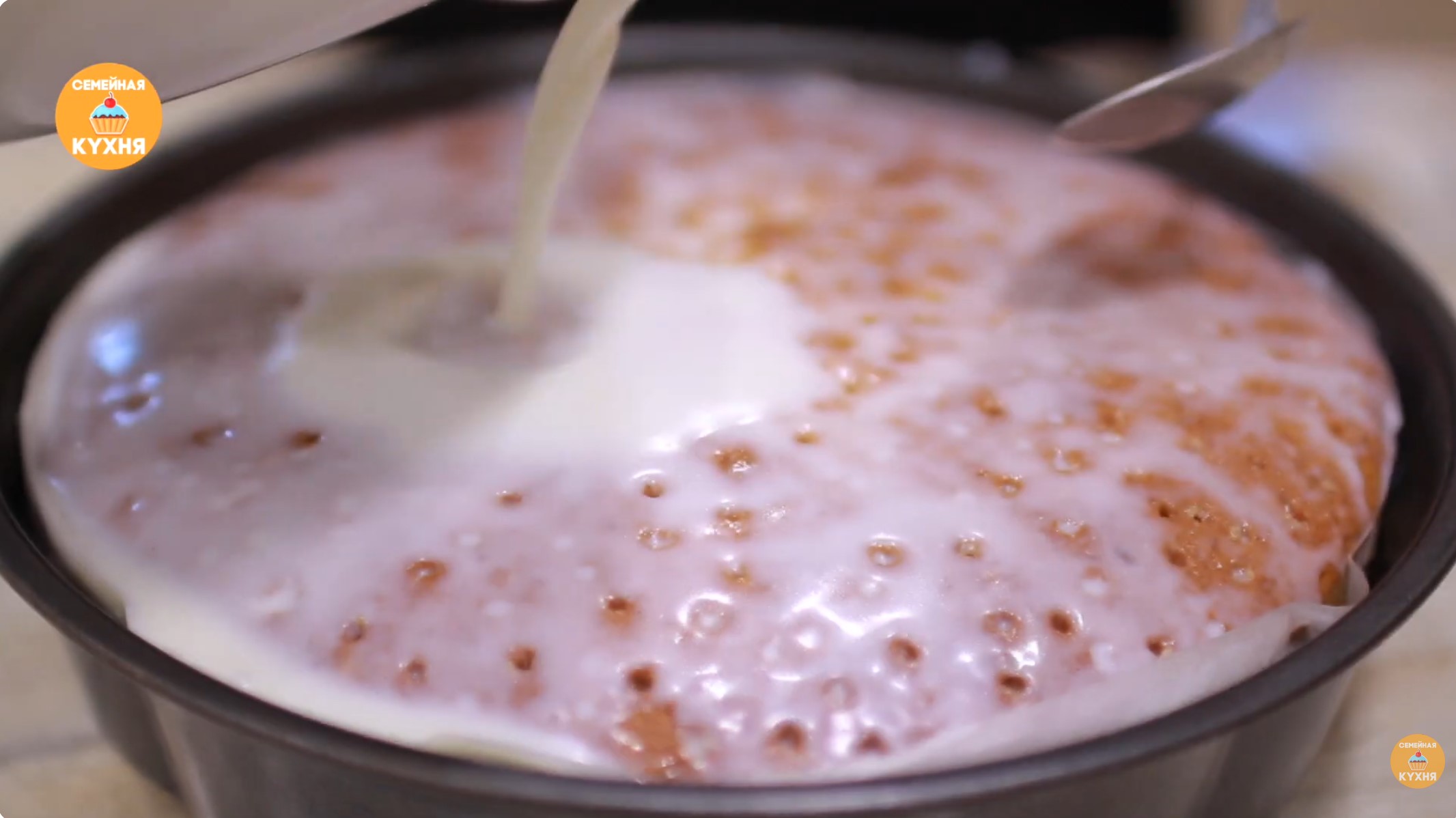 Пропитка и охлаждение • Достаньте готовый кекс из духовки и дайте ему немного остыть до теплого состояния. • Сделайте деревянной палочкой очень частые проколы по всей поверхности коржа. • Залейте кекс подготовленной молочной смесью. • Уберите десерт в холодильник на несколько часов (лучше на ночь), чтобы он как следует пропитался.