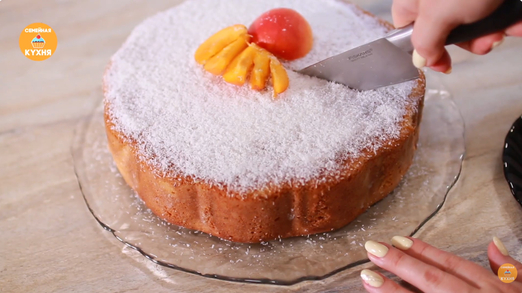Подача • Когда заливка полностью впитается, аккуратно переверните кекс на блюдо и снимите форму. • Сверху обильно посыпьте оставшейся кокосовой стружкой. В результате получается очень пористый, нежный и сочный десерт, который сочетает в себе ароматы абрикоса и кокоса и не требует дополнительного крема.