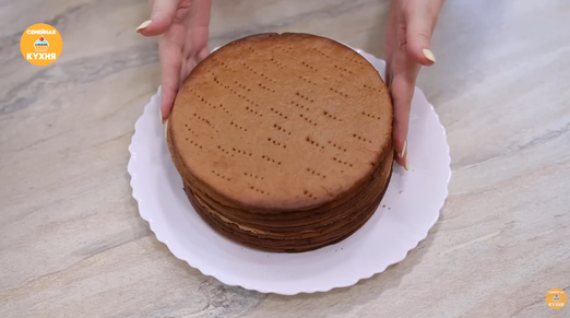 3. Выпечка: Отправляйте коржи в разогретую до 190 градусов духовку на 5–7 минут. При использовании режима конвекции время сокращается до 5 минут. В итоге должно получиться около 13 коржей (включая корж из обрезков).