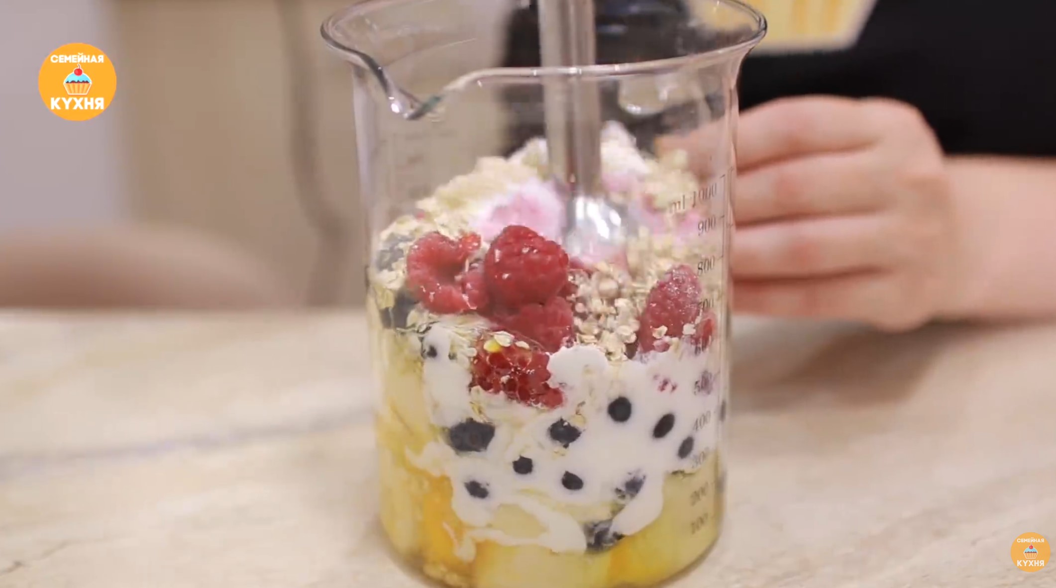 3. Добавление ягод и овсянки: Всыпьте в общую массу ягоды малины и добавьте 2–3 столовые ложки овсяных хлопьев. 4. Смешивание: Тщательно взбейте все ингредиенты блендером до получения однородного теста.