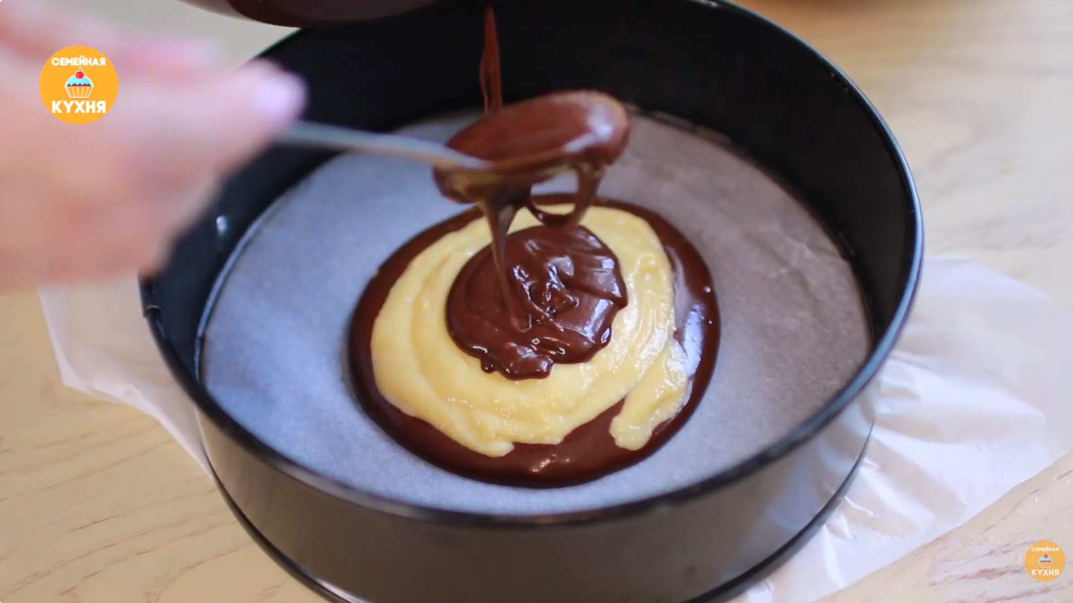 Формирование пирога В центр подготовленной формы для выпечки по очереди наливайте по две столовых ложки каждого вида теста. Начните с шоколадного, затем в его центр добавьте тыквенное, и продолжайте чередовать слои, пока всё тесто не закончится.