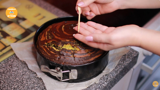 Завершение Дайте готовому пирогу немного остыть в форме, после чего аккуратно извлеките его. Теперь ароматную «Зебру» можно разрезать и подавать к столу. Приятного аппетита!