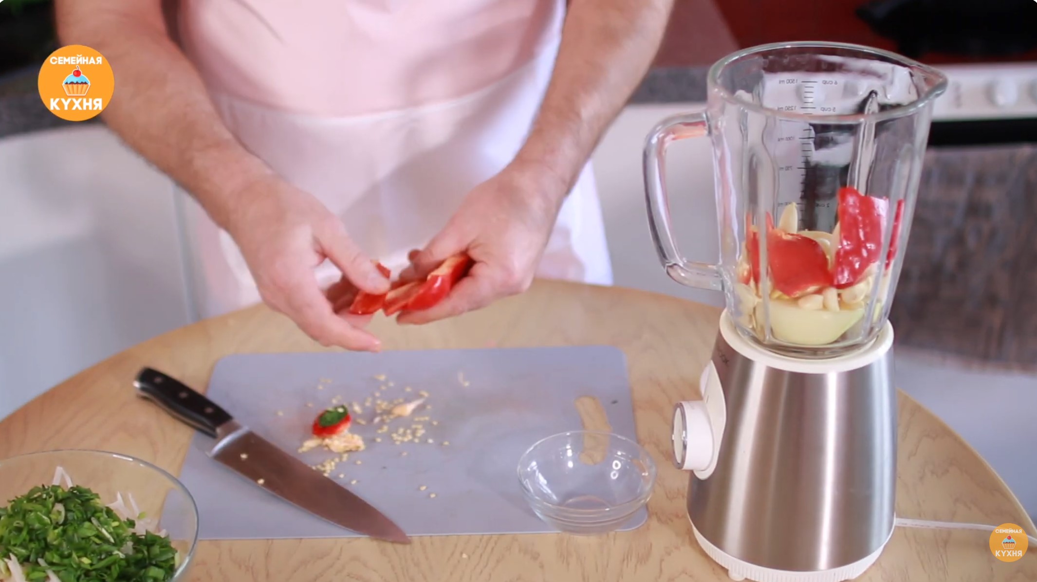 Приготовление острой пасты («кашицы»). В блендер отправьте нарезанный на части репчатый лук, кусочки имбиря, чеснок и красный сладкий перец (предварительно очищенный от семян). Измельчите всё в однородную кашицу.