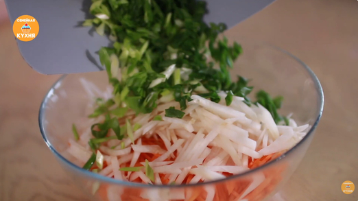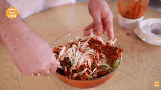 Выложите получившуюся острую смесь к нарезанным овощам (моркови, редьке и луку) и хорошенько перемешайте. Дайте начинке настояться, пока досаливается капуста.