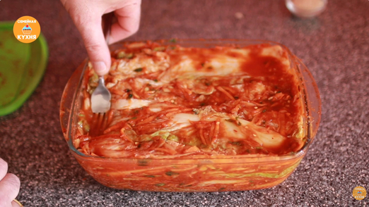 Уложите капусту в глубокую емкость, закройте крышкой и оставьте при комнатной температуре на пару дней для начала процесса ферментации (брожения). Через двое суток, когда появятся пузырьки и характерная кислинка, попробуйте закуску и уберите её в холодильник. Готовая закуска получается пряной, жгучей, слегка сладковатой и кислой, что отлично помогает поднять аппетит.