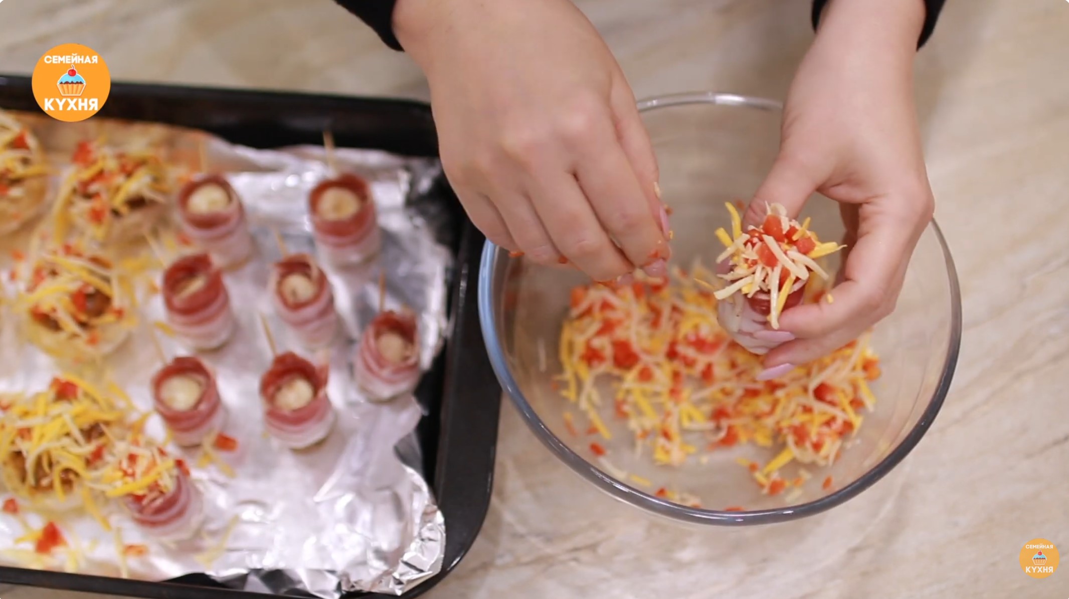 Очень мелко нарежьте болгарский перец и смешайте его с тёртым сыром. Посыпьте этой смесью фаршированные шляпки и заполните «стаканчики» из бекона. Отправьте в разогретую до 200°C духовку на 15–20 минут, пока сыр хорошо не подрумянится. Совет: Эта закуска получается очень сочной и вкусной как в горячем, так и в холодном виде. Приятного аппетита!
