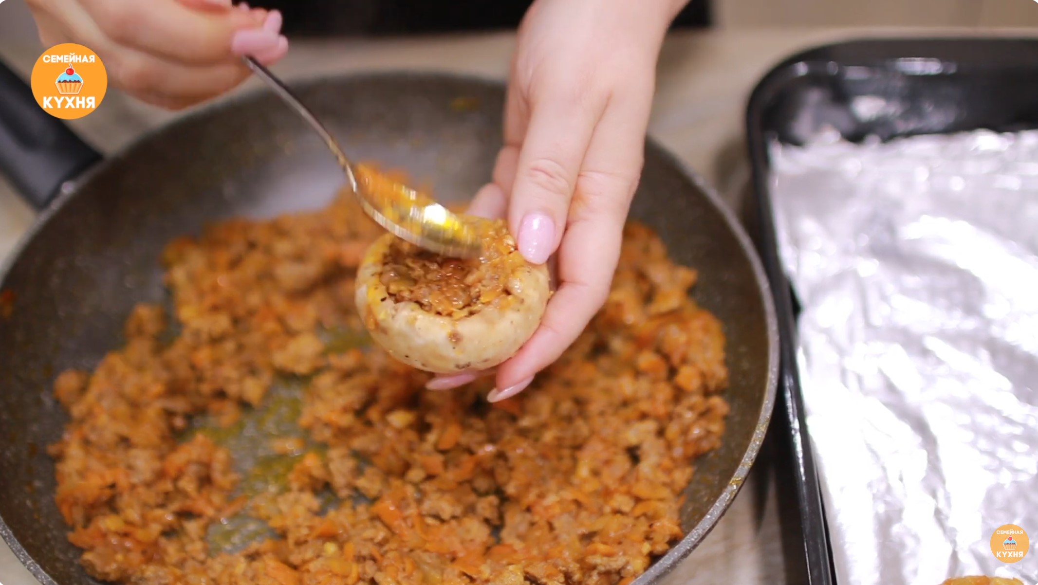 Наполните подготовленные шляпки грибов готовой мясной начинкой (можно использовать горячую начинку сразу).