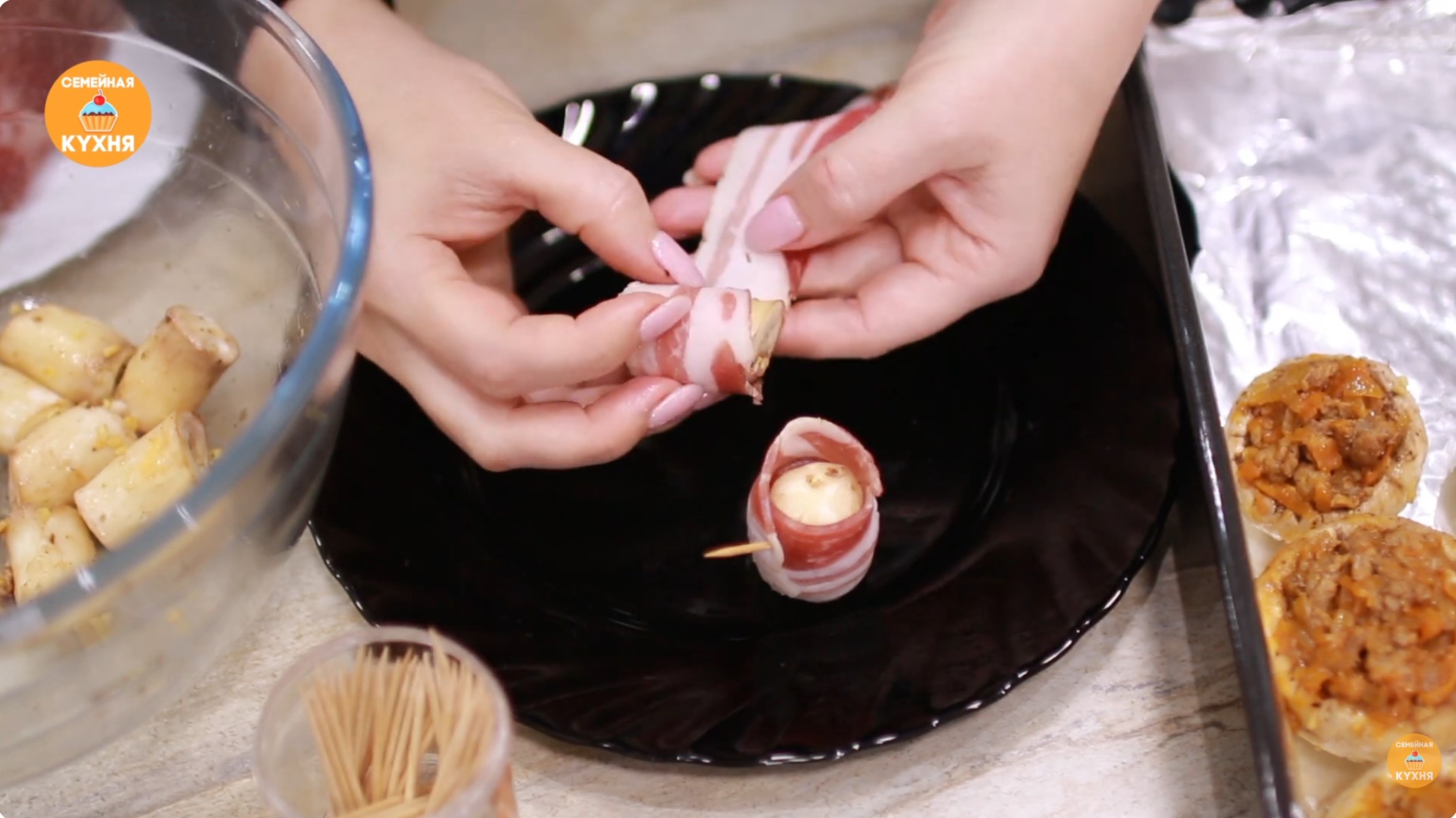 Возьмите ленточку бекона и оберните ею ножку гриба так, чтобы сверху получилось небольшое углубление (в виде стаканчика). Скрепите бекон зубочисткой (палочкой).