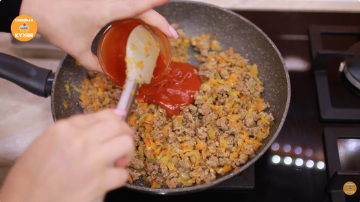 Выложите фарш к обжаренным овощам. Посолите, поперчите и обжаривайте на медленном огне до полуготовности (пока мясо не побелеет). Добавьте в фарш томатный соус, перемешайте и обжаривайте ещё пару минут.