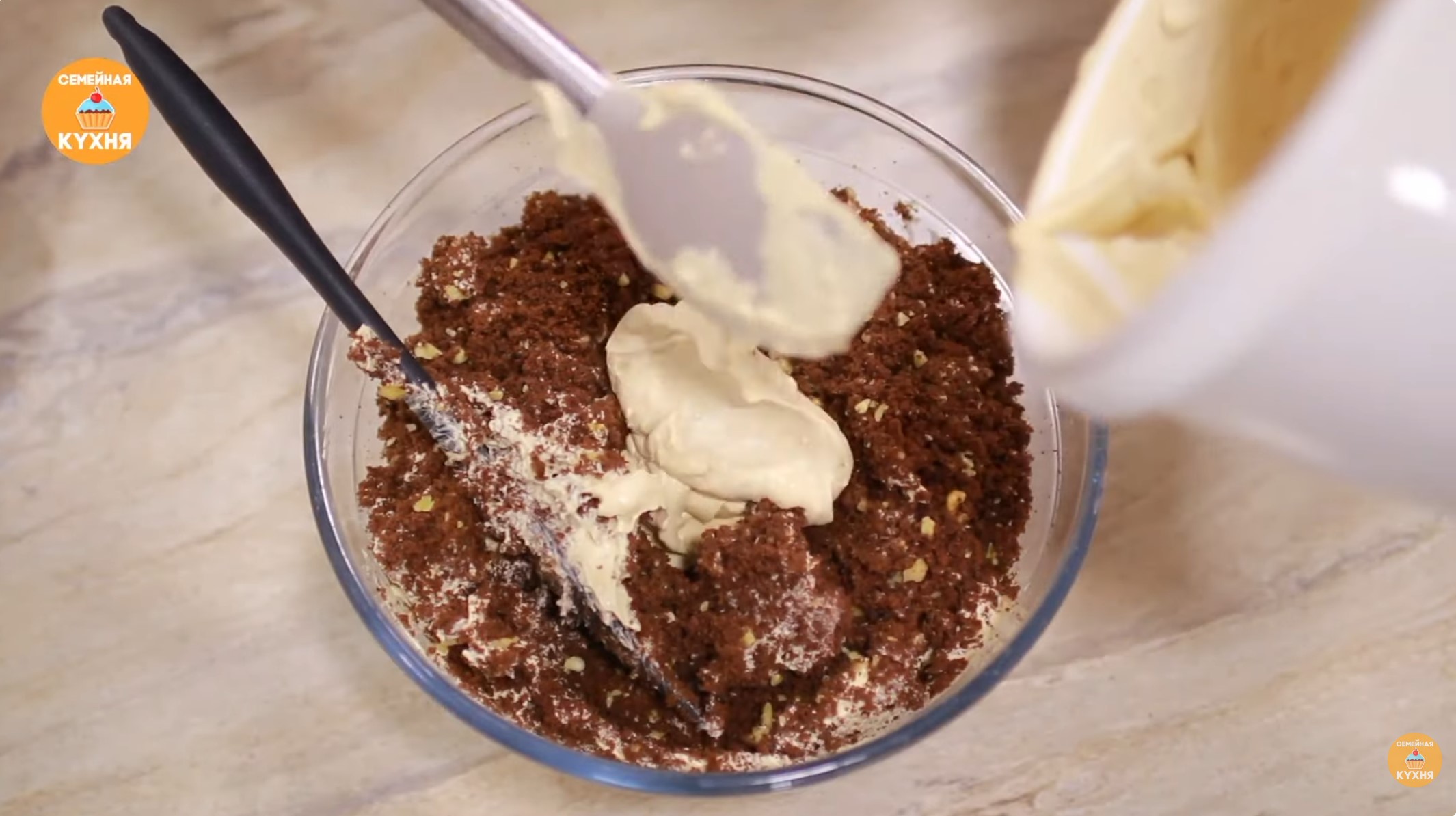 1. Остывший бисквит нарежьте на куски и натрите на крупной терке, чтобы получилась мелкая воздушная крошка. 2. Смешайте бисквитную крошку с измельченными орехами. 3. Постепенно, в несколько приемов, добавляйте крем в крошку, тщательно перемешивая. Масса должна получиться однородной, но при этом остаться воздушной и не «забитой».