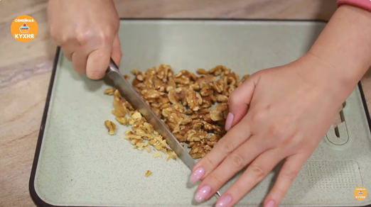 1. Взбейте холодные жирные сливки в пышную пену. 2. Добавьте к сливкам варёную сгущёнку и перемешайте до состояния густого однородного крема. 3. Грецкие орехи слегка подсушите на сковороде для более яркого вкуса и нарежьте небольшими кусочками (не слишком мелко).