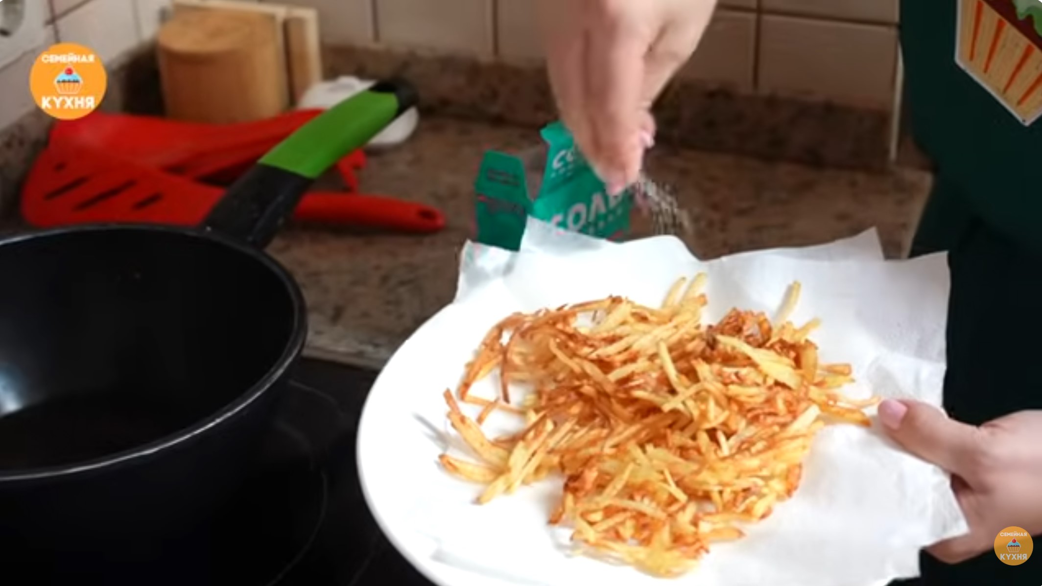 Приготовление картофеля. пай Картофель необходимо нарезать очень тонкой соломкой. В глубокую сковороду налейте масло для фритюра и разогрейте его. Обжаривайте картофель порциями до золотистого цвета. Готовый картофель выложите на салфетку, чтобы впитался лишний жир, и посолите, пока он еще горячий.