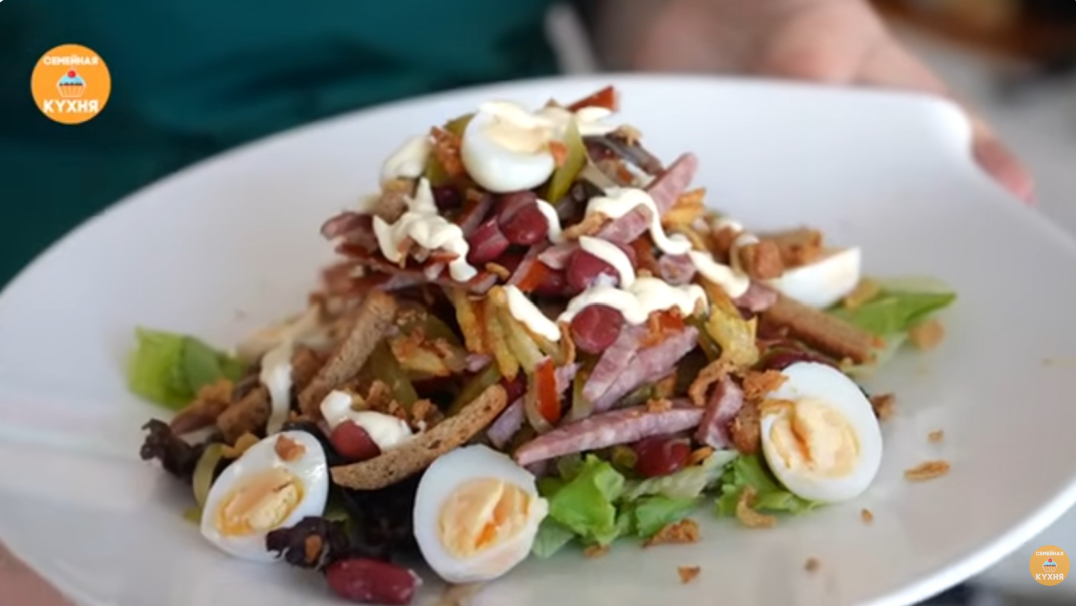 Сборка и подача (порционный вариант) 1. На тарелку выложите «подушку» из листьев салата. 2. Сверху горкой выложите смесь основных ингредиентов. 3. По бокам добавьте вареные яйца (перепелиные или нарезанные дольками куриные). 4. Добавьте ржаные сухарики. 5. Посыпьте салат сверху готовым луком во фритюре. 6. Полейте сверху майонезом. Советы по подаче Этот салат отлично подходит для праздничного стола, так как выглядит ярко и по-осеннему. Если вы решите подавать его в большой салатнице, смешайте все ингредиенты, кроме лука и сухариков — ими лучше посыпать блюдо непосредственно перед подачей, чтобы они остались хрустящими.