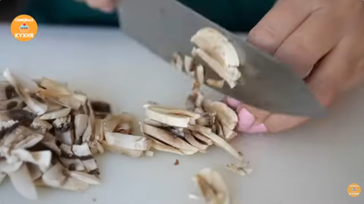 Подготовка и обжарка грибов. Нарежьте свежие шампиньоны тонкой соломкой. Выложите их на сухую сковородку и обжаривайте без добавления масла. Как только из грибов выпарится вся влага, они готовы — снимите их с огня, переложите на тарелку для остывания и слегка присолите.