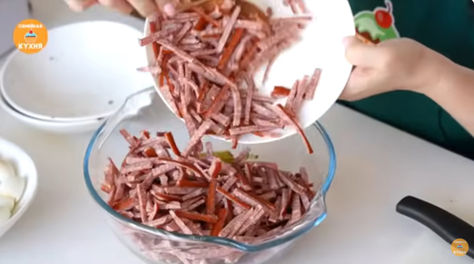 Нарезка остальных ингредиентов. Копченые охотничьи колбаски и маринованные огурцы также нарежьте мелкой соломкой. Если вы планируете смешивать салат в общей посуде, то яйца и листья салата тоже следует нарезать.