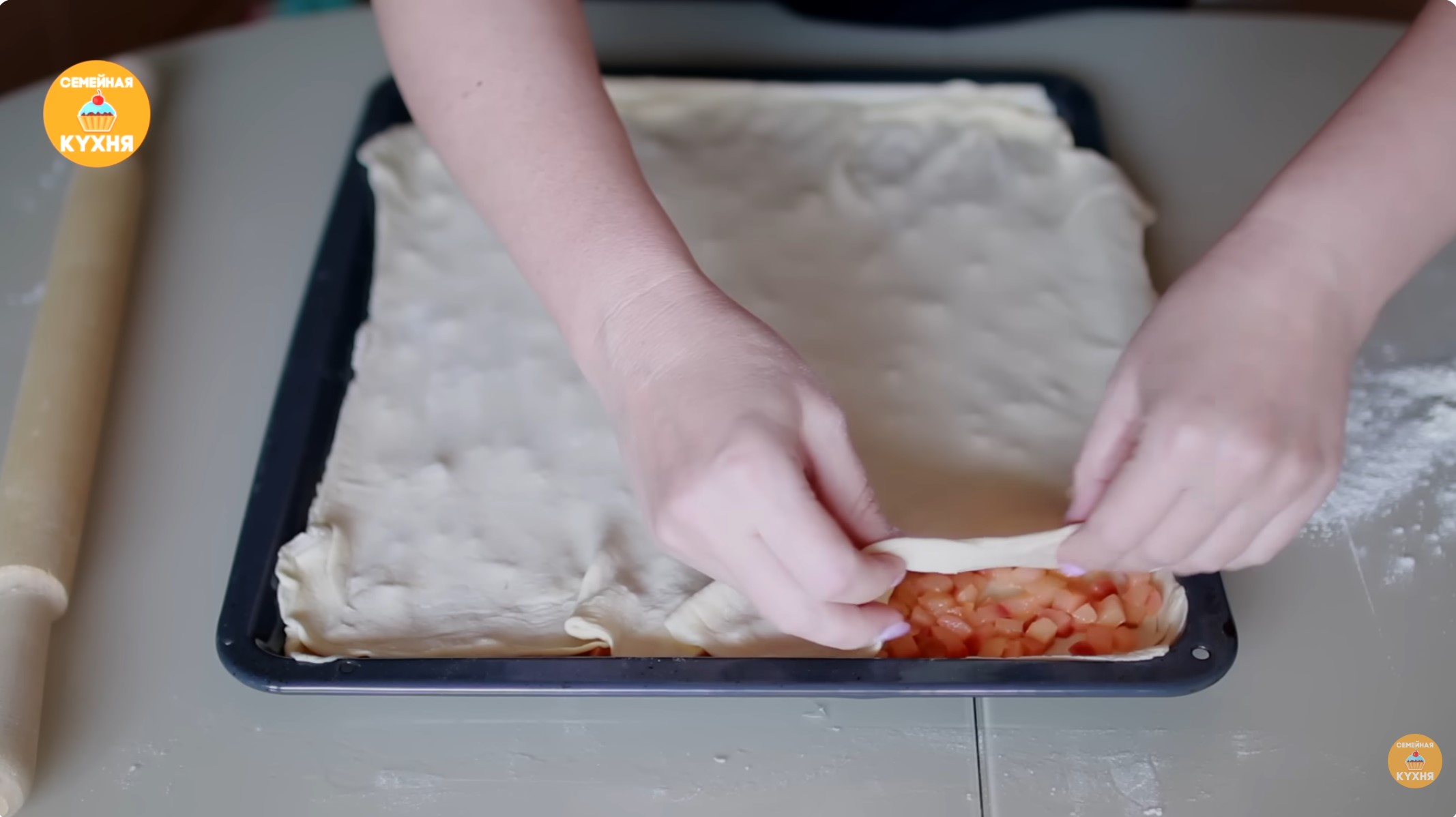 3. Подготовка и выпекание коржей 1. Разделите 500 г теста на две части и раскатайте каждую в очень тонкий пласт. 2. Перенесите один пласт на противень, сверху распределите яблочную начинку тонким слоем. 3. Накройте вторым тонким пластом теста и защипните края (позже они пойдут на обсыпку). 4. Сделайте на тесте небольшие насечки, чтобы оно сильно не вздувалось. 5. Выпекайте в разогретой до 200°C духовке (режим «верх-низ») примерно 25 минут. Готовую заготовку полностью остудите.