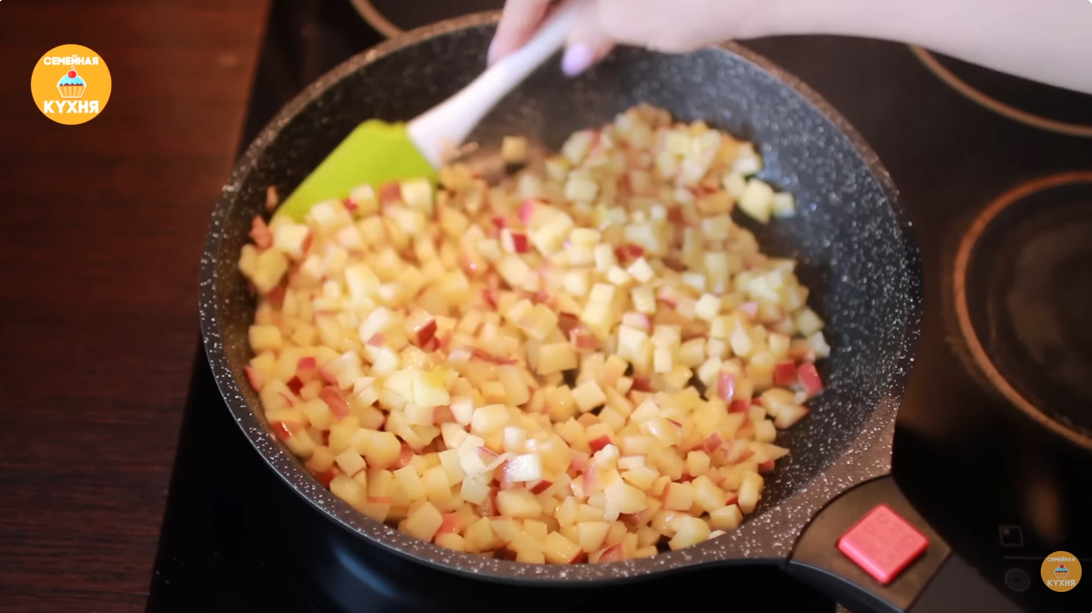 1. Приготовление яблочной начинки 1. Нарежьте яблоки мелким кубиком. Кожуру можно не очищать — это по желанию. 2. На сковороде растопите кусочек масла с половиной объема ванильного сахара. 3. Выложите яблоки и тушите их, периодически помешивая, до легкой мягкости. 4. Обязательно выпарите весь сок на сильном огне, чтобы яблоки стали сухими, затем переложите их в тарелку для остывания. 5. В остывшие яблоки добавьте пюре маракуйи для придания аромата и легкой кислинки.