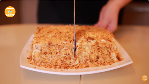 5. Сборка торта 1. У остывшего испеченного пирога обрежьте края и разрежьте его на четыре равные части. 2. Обрезки измельчите в крошку для украшения. 3. Смажьте блюдо небольшим количеством крема для фиксации и выложите первый корж. 4. Щедро промазывайте каждый слой кремом, собирая торт. 5. Обмажьте кремом верх и бока торта, после чего обильно обсыпьте крошкой.