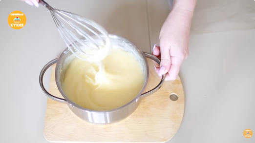 4. Финальная сборка крема 1. Взбейте холодные жирные сливки до легкого загустения. 2. Немного взбейте миксером остывшую заварную основу. 3. Соедините обе массы и аккуратно перемешайте (долго взбивать не нужно, чтобы сливки не расслоились).