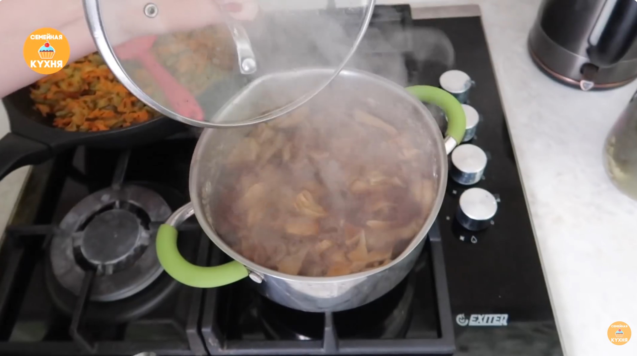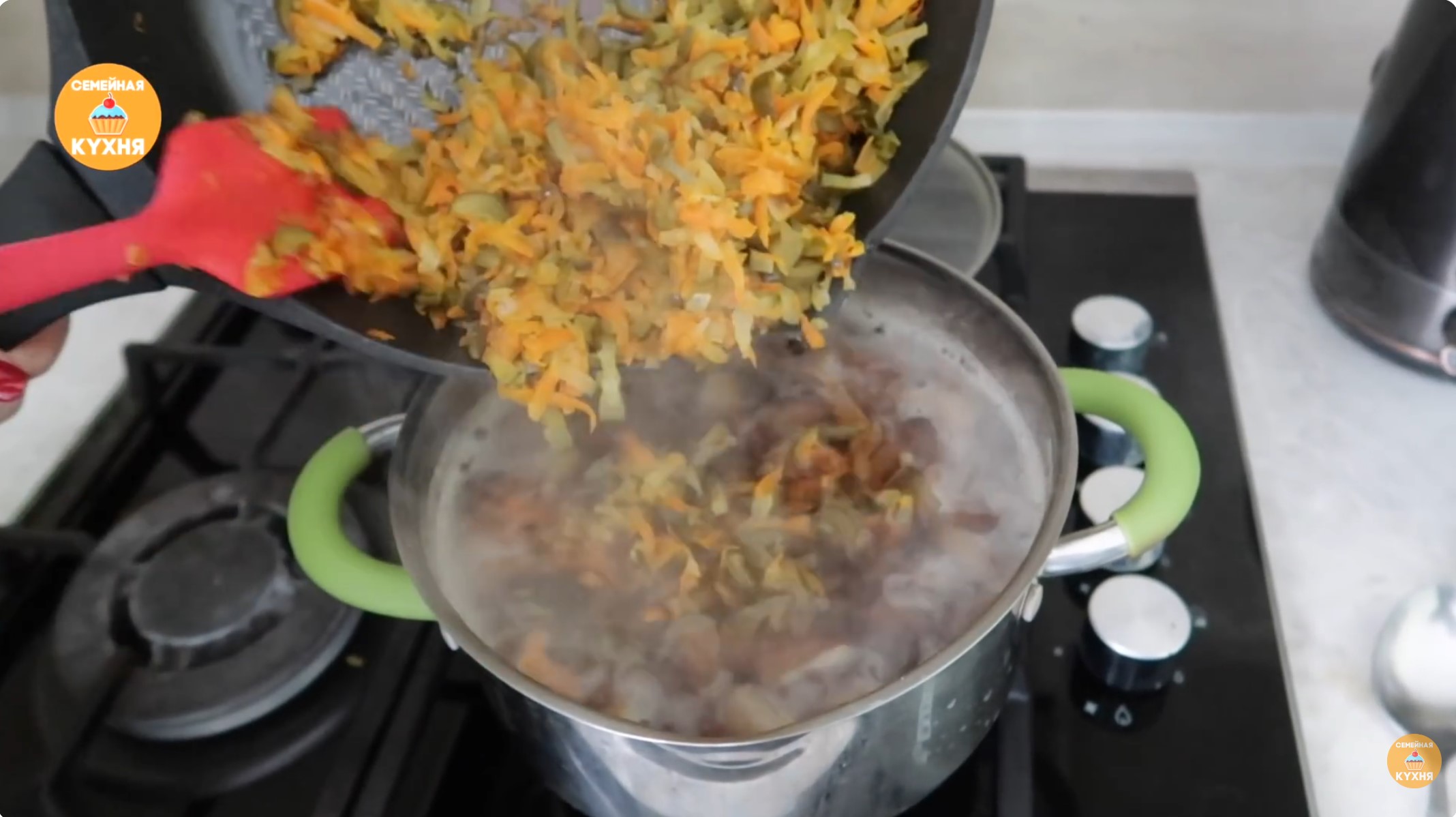 Через 5 минут после того, как вода снова закипит, добавьте в кастрюлю готовую зажарку из лука, моркови и огурцов.