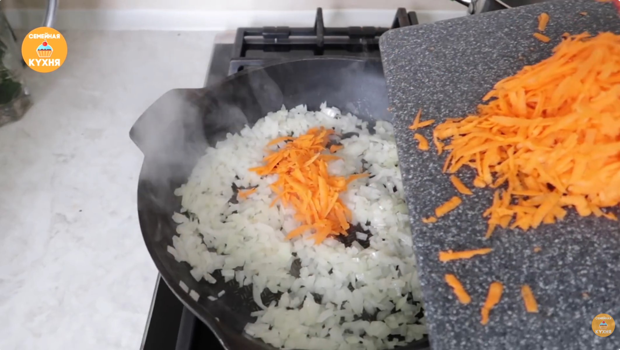 Мелко нашинкуйте репчатый лук и обжарьте его на сковороде с небольшим количеством растительного масла. Добавьте к луку натертую на крупной терке морковь и продолжайте обжаривать.