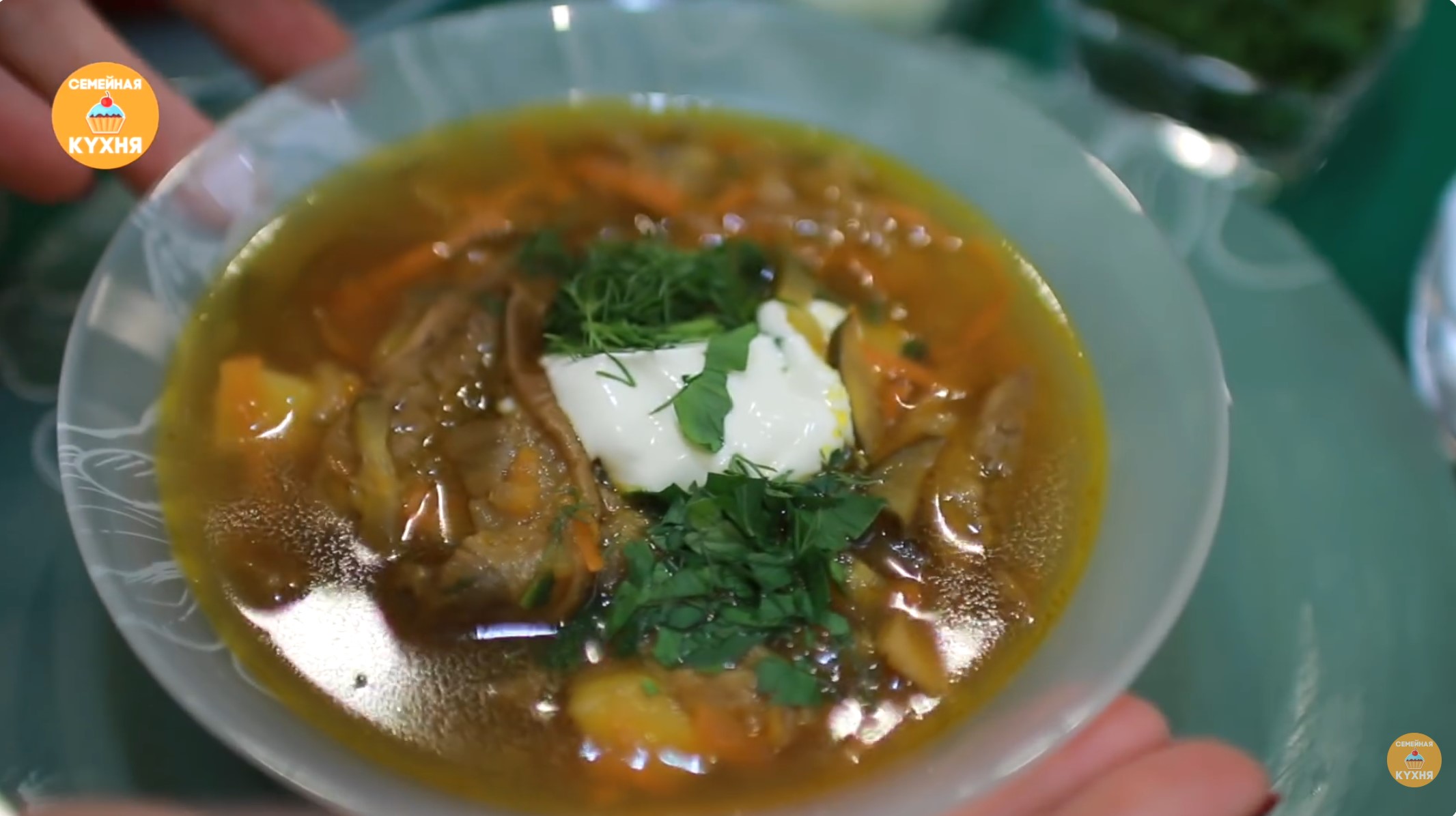Накройте суп крышкой и продолжайте варить до полной готовности картофеля. 7. Подача: Разлейте ароматную похлебку по тарелкам, добавьте в каждую ложку сметаны и, по желанию, мелко нарезанную зелень укропа и петрушки.