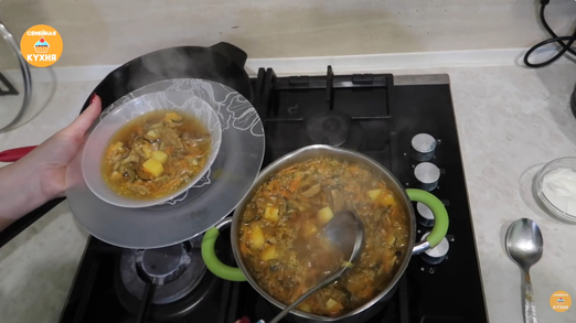 Заправка рассолом: Это ключевой этап, так как в данном рецепте рассол используется вместо соли. Используйте только рассол от квашеных или соленых (бочковых) огурцов. Вливайте его в суп постепенно, перемешивайте и пробуйте, чтобы отрегулировать степень солености по вашему вкусу.