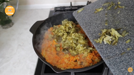 Нарежьте соленые огурцы (300 г) соломкой, добавьте их в сковороду к овощам и обжаривайте всё вместе еще около 5 минут.