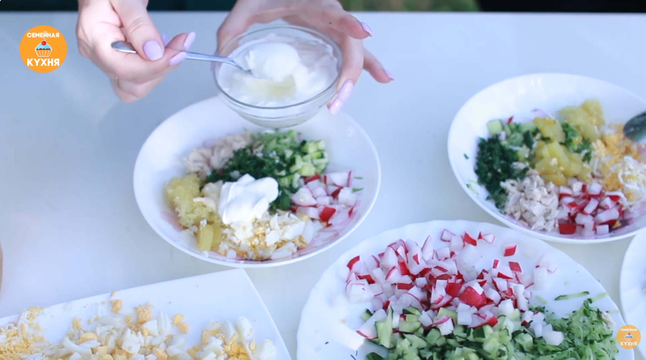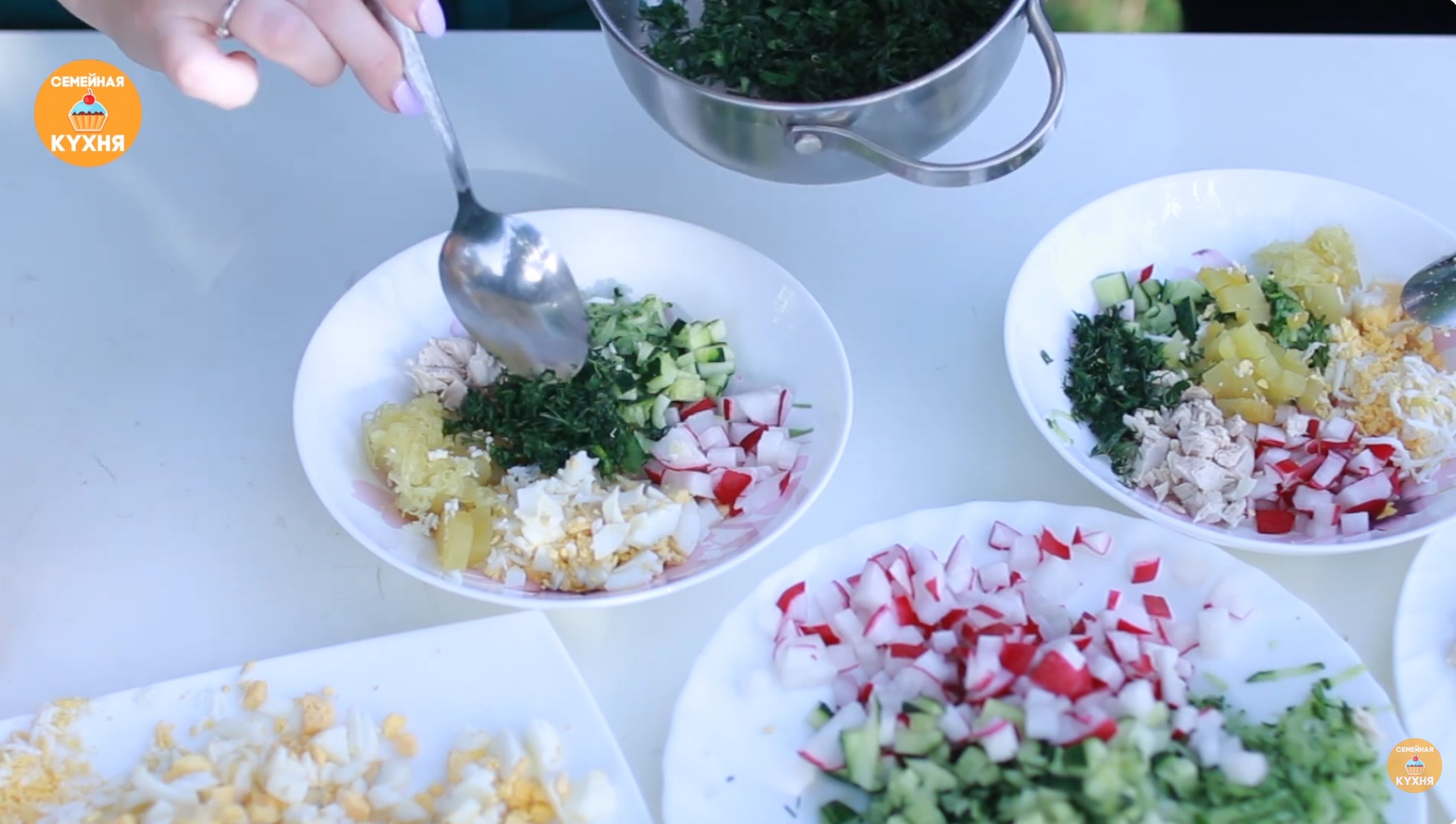 Сборка порции (ресторанная подача). Собираем окрошку порционно в каждой тарелке. В тарелку поочередно выложите: • Нарезанные кубиком и натертые яйца и картофель. • Редис, мясо и нарезанные огурцы. • Немного натертого огурца и подготовленную зелень.