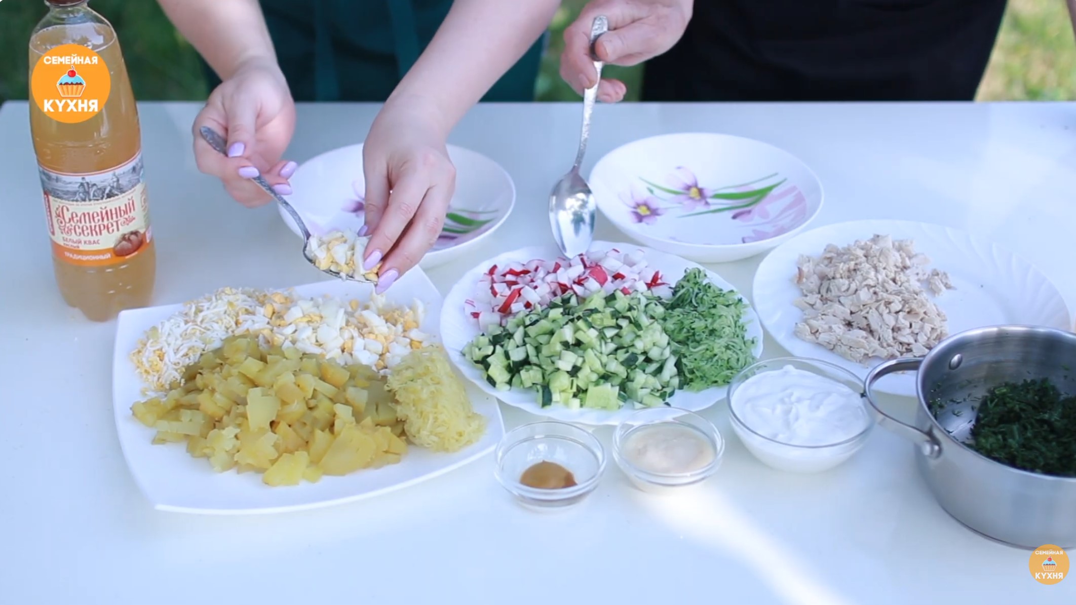 Нарезка основных ингредиентов. Мясо, огурцы, редис, картофель и яйца нарежьте мелким кубиком. Важно, чтобы кусочки овощей и мяса были примерно одинакового размера.