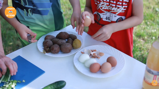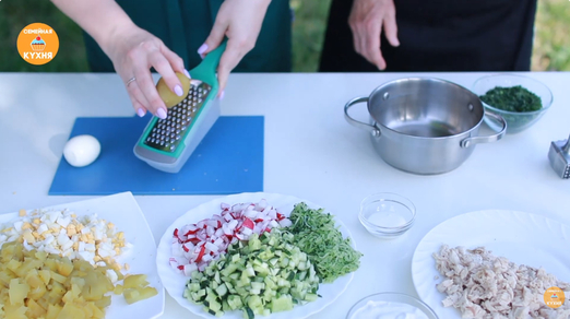 Первый секрет: натирание для густоты и аромата. Чтобы окрошка получилась более насыщенной, густой и ароматной, часть продуктов нужно натереть на средней терке: • Натрите один огурец (для свежести и аромата). • Натрите одно яйцо и одну картофелину (для придания блюду густоты).
