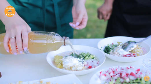 Завершение. Залейте содержимое тарелки холодным квасом и слегка перемешайте. Блюдо готово к подаче. Примечание: Если вы находитесь в условиях, где невозможно достать подходящий квас, есть альтернативный вариант окрошки на минеральной воде.