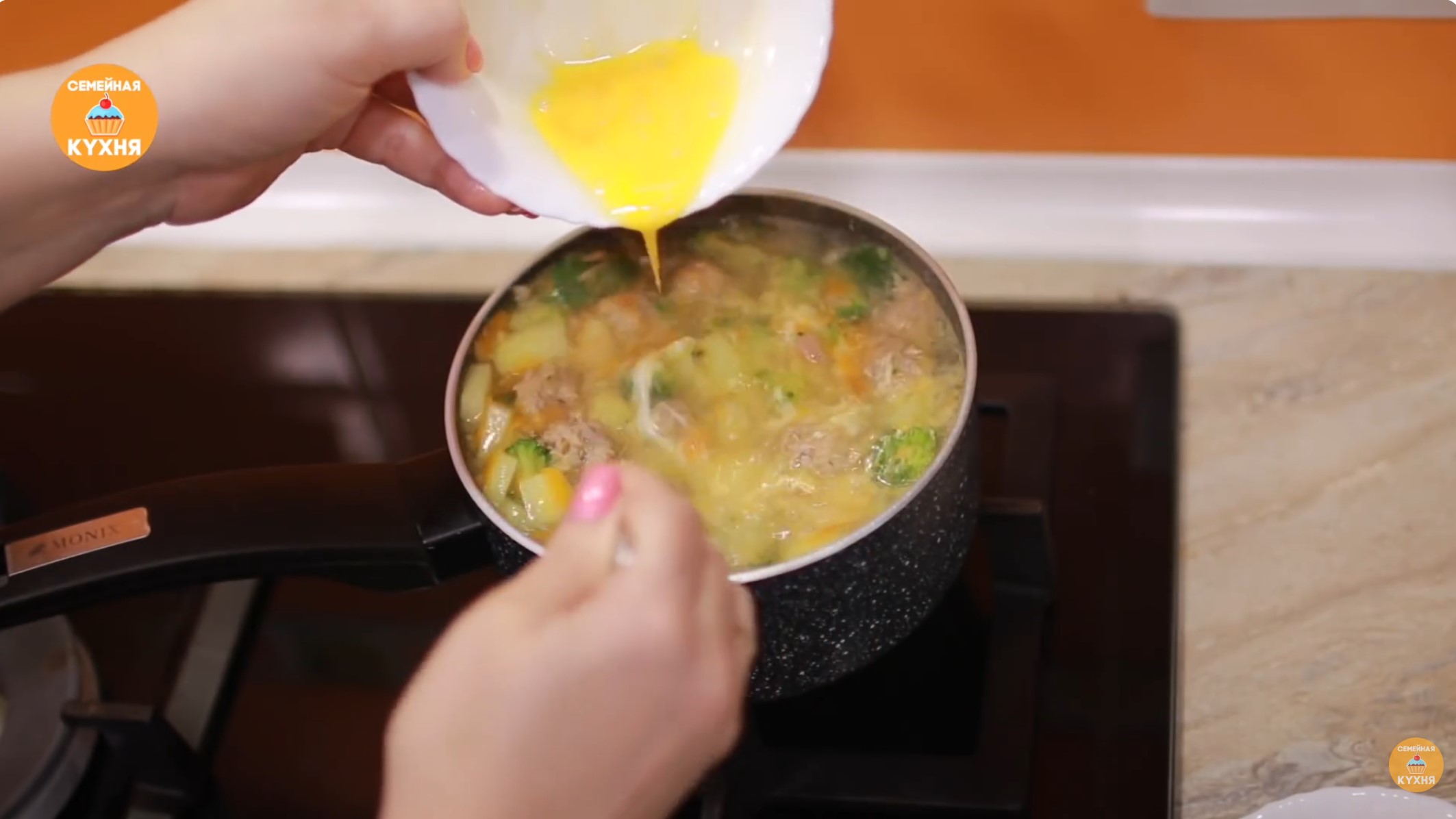 В хорошо кипящий бульон влейте яйцо тонкой струйкой, постоянно перемешивая суп, чтобы получились «завитушки».