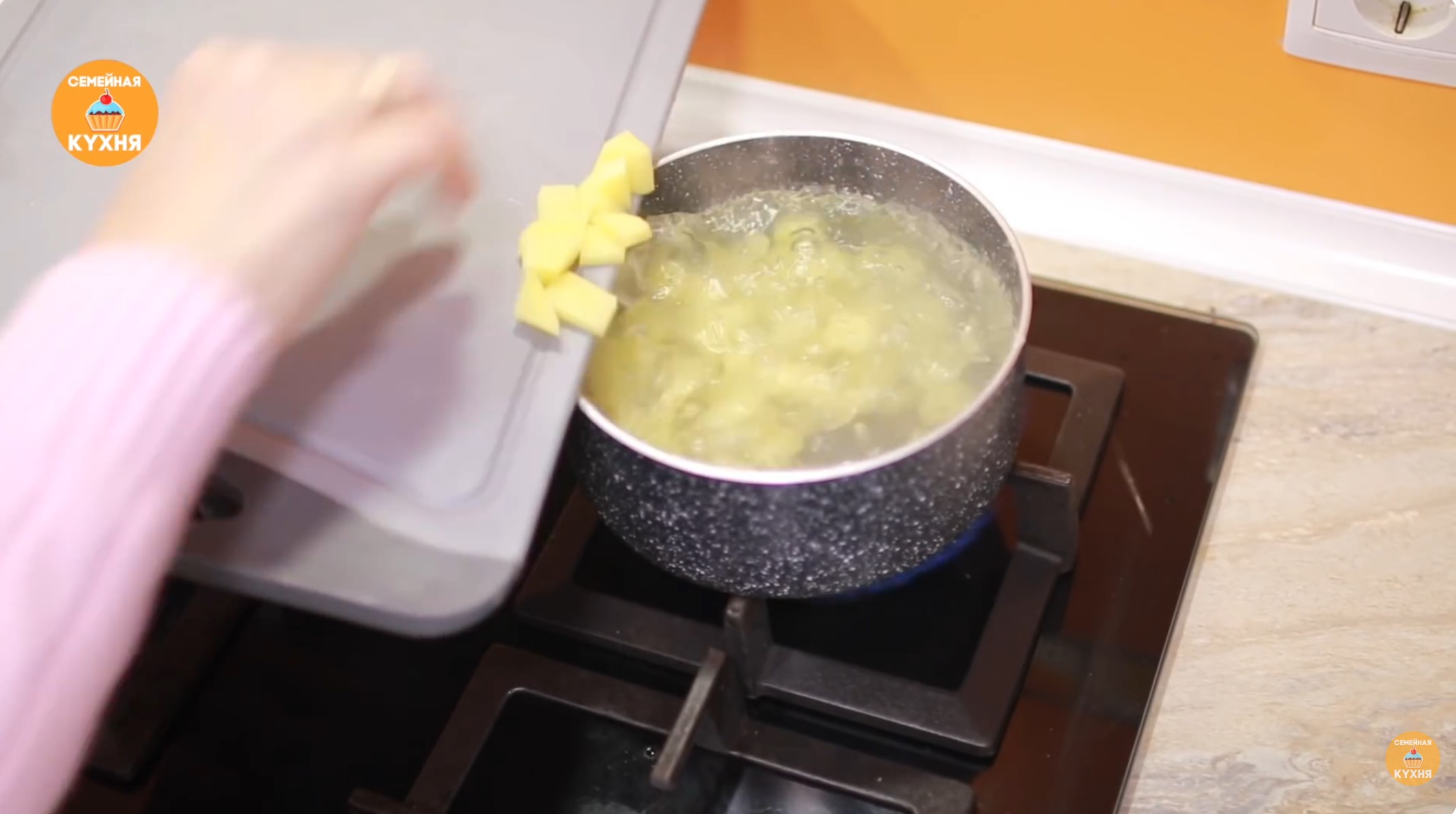Налейте воду или бульон в кастрюлю и доведите до кипения. Очищенный картофель следует нарезать мелким кубиком, чтобы малышу было удобно его есть и он быстро сварился. Натрите морковь на крупной терке (можно мелко нарезать, но на терке она сварится быстрее).