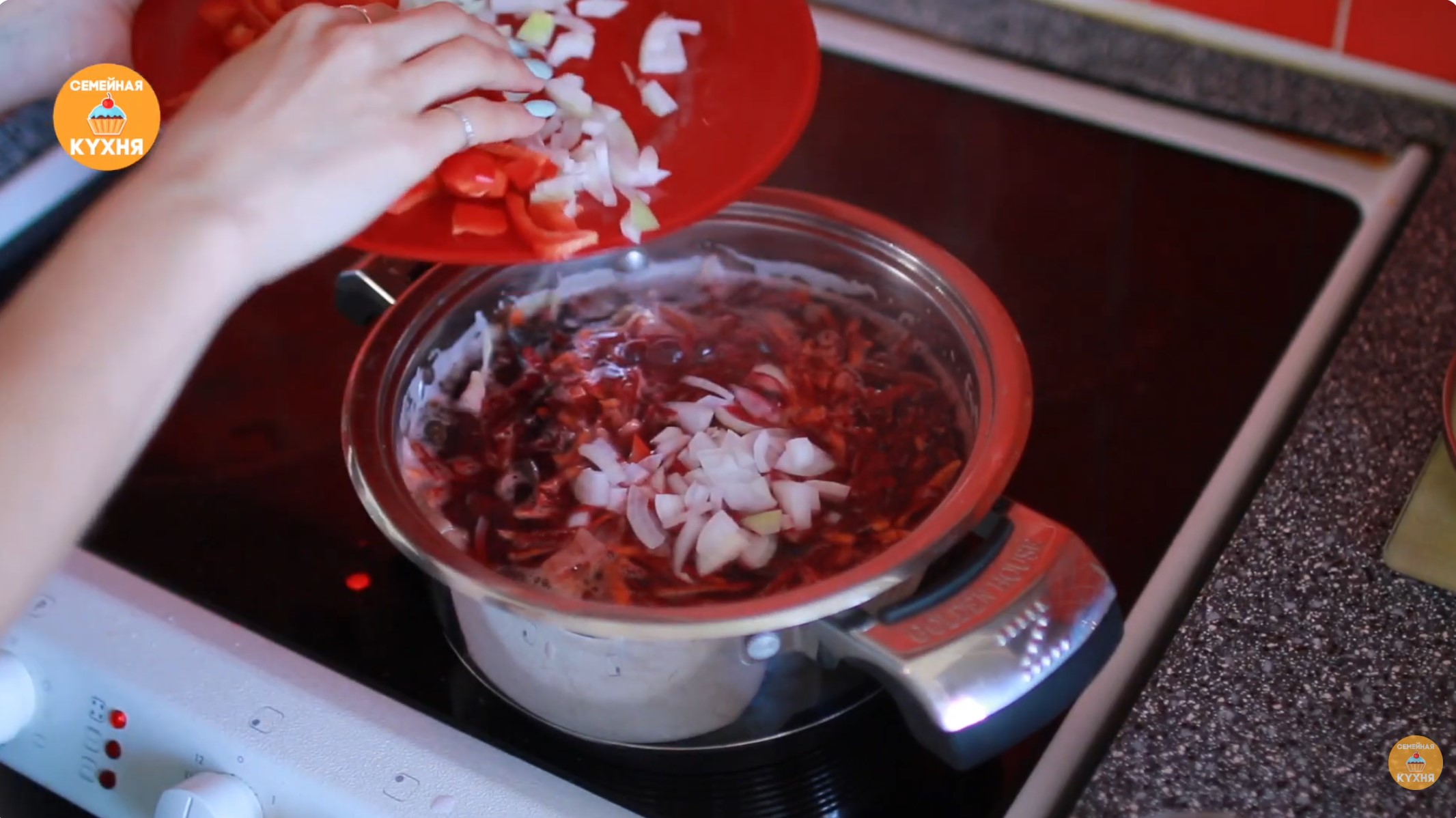 • Как только картофель с капустой закипят, отправьте в кастрюлю остальные овощи: лук, болгарский перец, натертую морковь и свеклу. • Мы не делаем зажарку, а закладываем овощи сырыми, чтобы сохранить больше витаминов, но вы можете сделать зажарку по желанию.