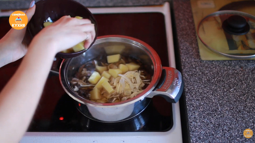 Основной процесс варки • Через 30 минут после закипания грибов добавьте к ним картофель и свежую капусту. Дождитесь закипания.