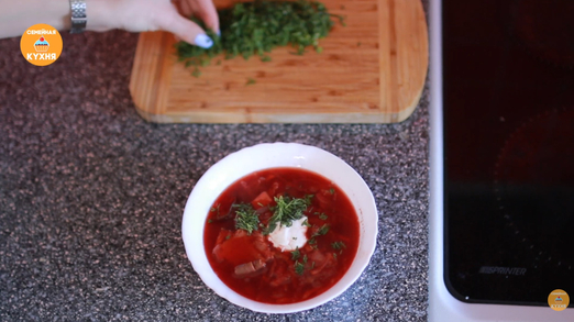 Завершение и подача • Последний штрих — добавьте мелко нарезанный чеснок, после чего выключайте огонь. • Дайте борщу настояться. Готовность определяйте по картофелю: если он сварился, значит, борщ готов. • При подаче добавьте свежую зелень (укроп, петрушку или зеленый лук) и, по желанию, сметану. Борщ получается очень густым («ложка стоит»), сытным и полезным.