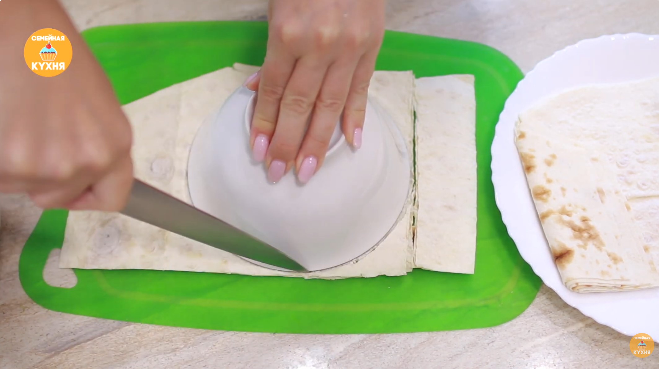 Подготовка «теста» из лаваша 1. В качестве замены обычному тесту используйте тонкий лаваш. 2. С помощью тарелки вырежьте из лаваша круги. Вы можете выбрать любой размер — сделать чебуреки побольше или поменьше. 3. Совет: Остатки лаваша не выбрасывайте, их можно использовать в дальнейшем для приготовления ленивой лазаньи или запеканки.
